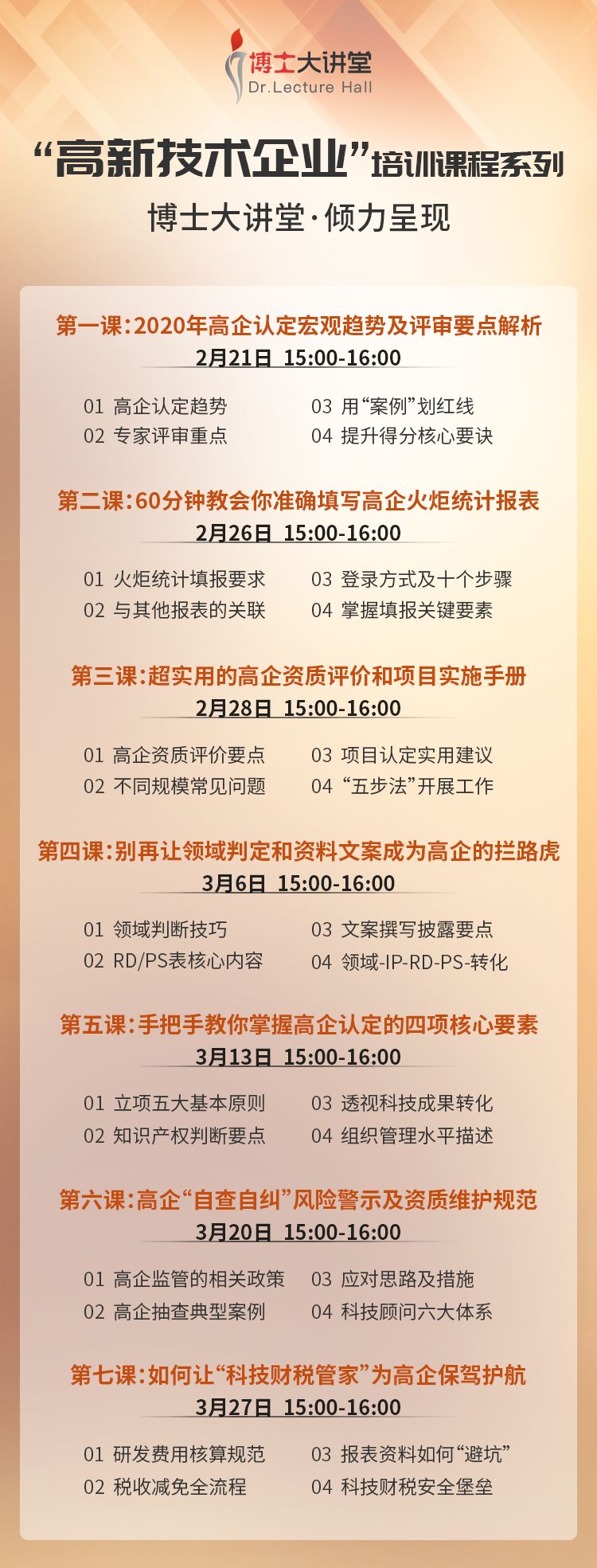 2020 年春节期间,因突如其来的新型冠状病毒肺炎疫情,我们的生活变得不一样。随着疫情抗战的严峻,社会各级全力以赴抗击肺炎。随着国家公布延长春节假期、各地又陆续公布延迟复工通知,注定我们春节后的工作也与往常有所不同。为了更好的帮助企业做好疫情期间的复工,即将开展“高新技术企业”培训课程系列,关注博士大讲堂,让您足不出户,掌握知识,在线学习,不要做错过哟!课程安排如下: